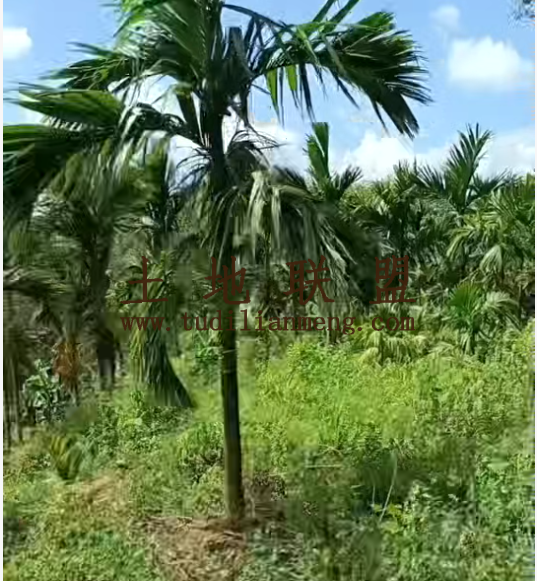 地块现状:地里现种植约5000棵槟榔,有约1500棵已挂果,剩余有大有小,地势为缓坡地,地里有约60平米生活用房。