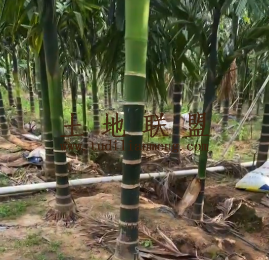 地块现状:地里现种植约6000棵槟榔,约3年树龄70%开花,地里已铺设好灌溉设施,地势平坦。